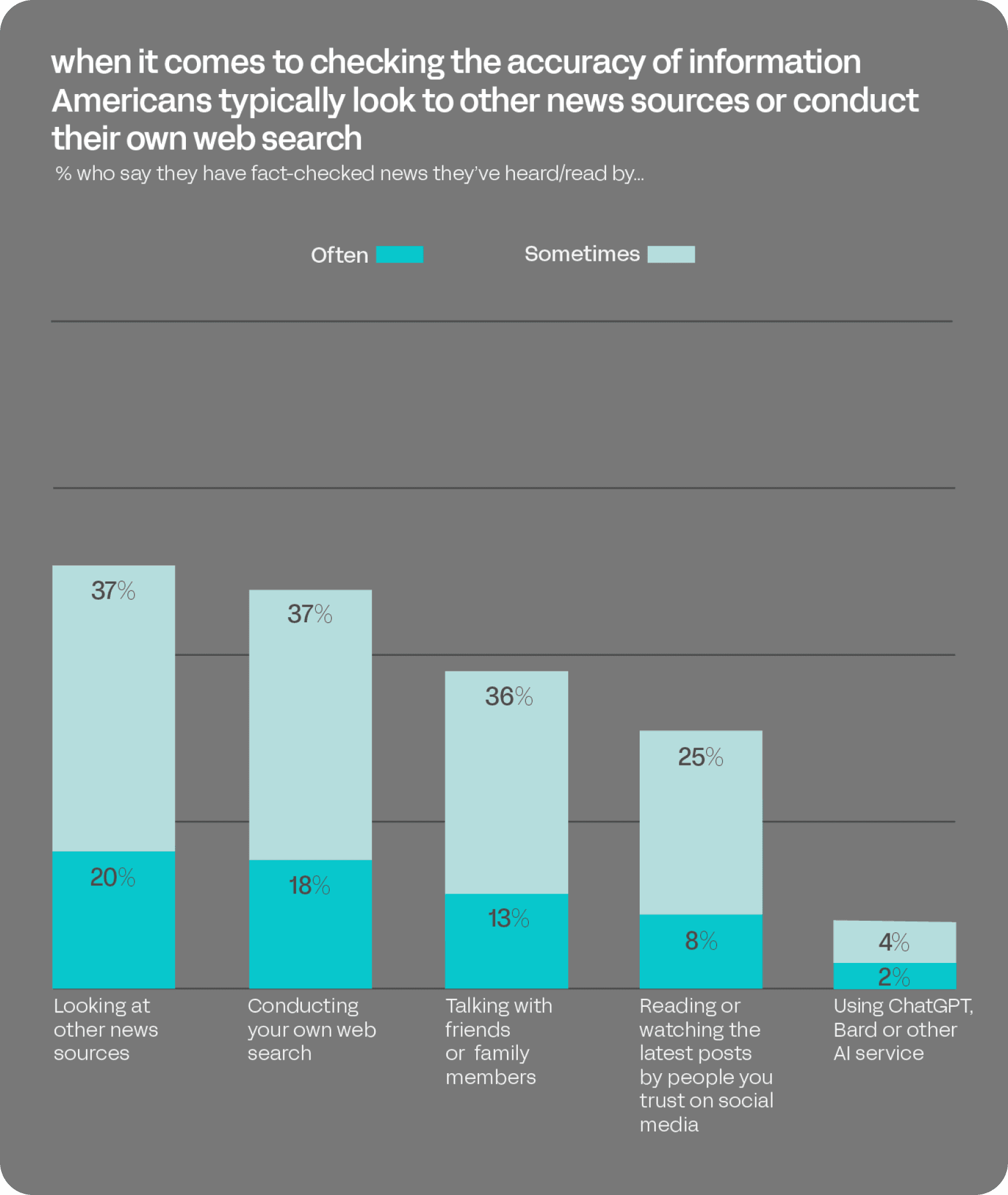 Many American adults report taking at least some steps to verify news and information about the 2024 U.S. Presidential election. Roughly, equal majorities say they often or sometimes look at other news sources (57%) or conduct their own web searches (56%). Just under half (48%) say they check the facts by consulting with friends and family. About a third (34%) rely on social media influencers for guidance. Just 6% say they employ generative AI services, such as ChatGPT, Bard or others to check the facts.