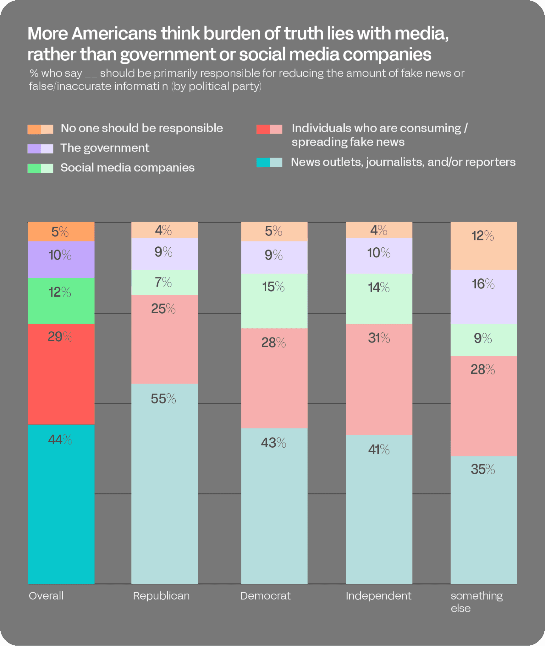 Republicans, more than Democrats or Independents, believe the burden of truth should be laid at the feet of news outlets and journalists (55% vs 43% and 41%, respectively). Reluctance towards government regulation is fairly consistent across the political spectrum, with roughly 1-in-10 among each group believing that the government should be primarily accountable.